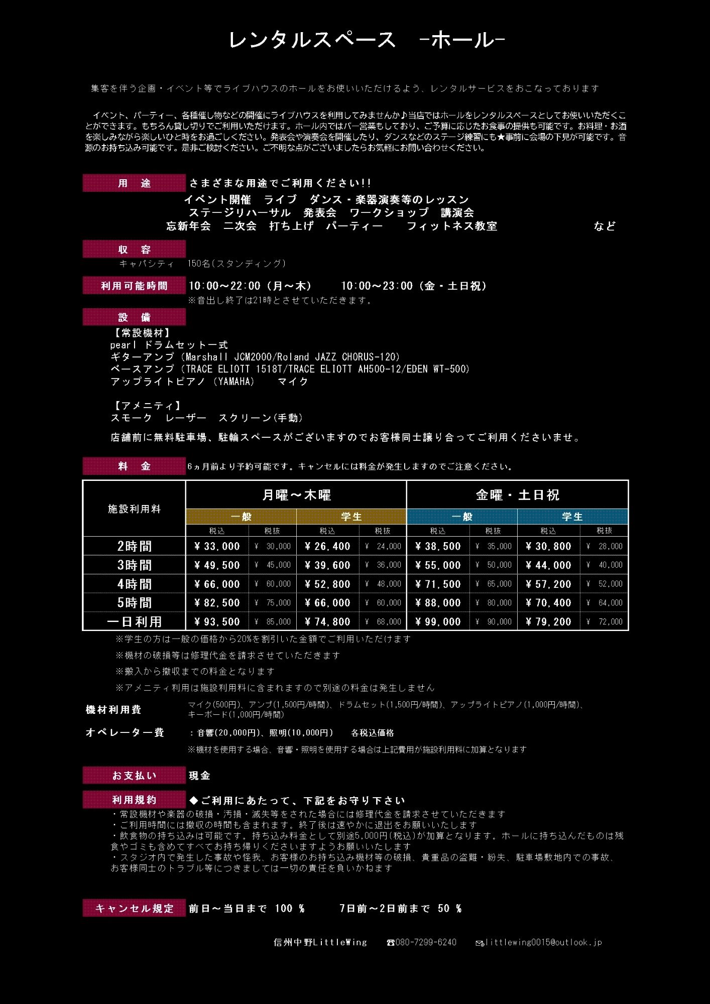 イベント、パーティー、各種催し物などの開催にライブハウスを利用してみませんか♪当店ではホールをレンタルスペースとしてお使いいただくことができます。貸し切りでのご利用にも対応しております。ホール内ではバー営業をしており、フードは併設の からあげママちきんのお料理をご提供。ご予算に応じたお食事の提供が可能です。お料理・お酒を楽しみながら楽しいひと時をお過ごしください。発表会や演奏会を開催したり、ダンスなどのステージ練習にも★二次会やパーティなどにもご利用ください。事前に会場の下見が可能です。お気軽にお問い合わせくださいませ。